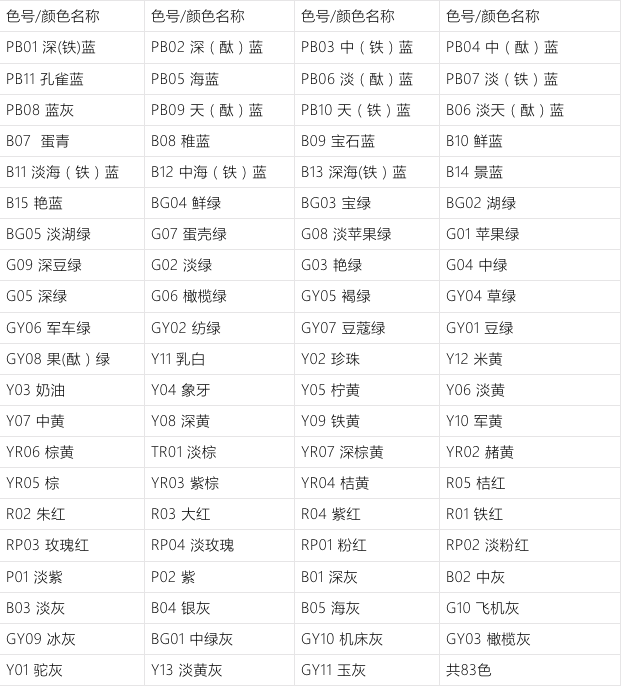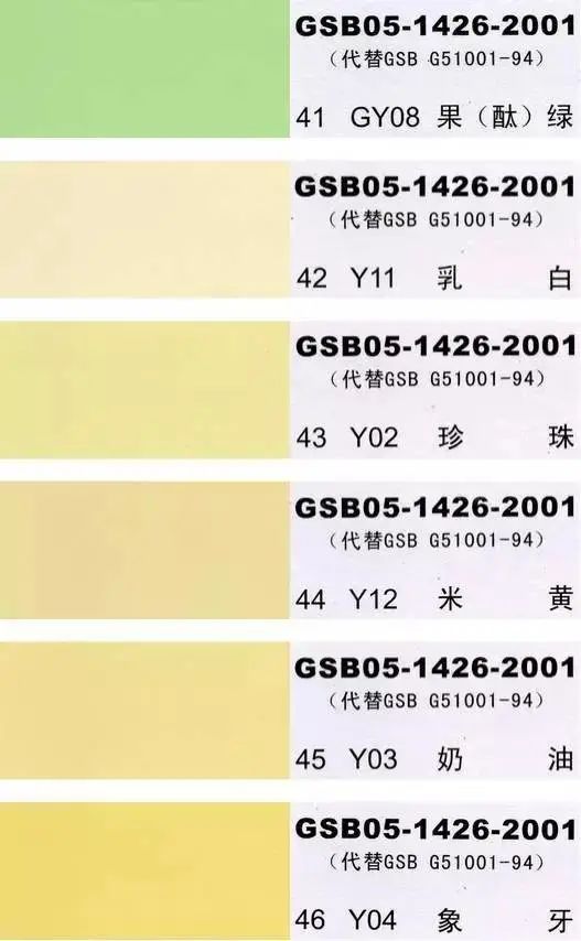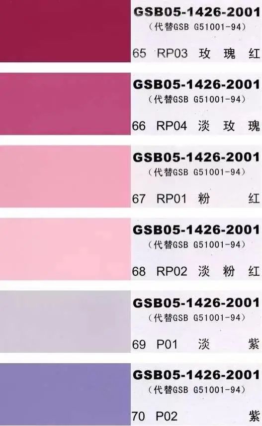GSB05-1426-2001全国涂料和颜料标准化技术委员会修订,共包含有83种颜色,光面效果。每个颜色都有国家统一标准的编号,比较适用于油漆涂料选定色号使用。