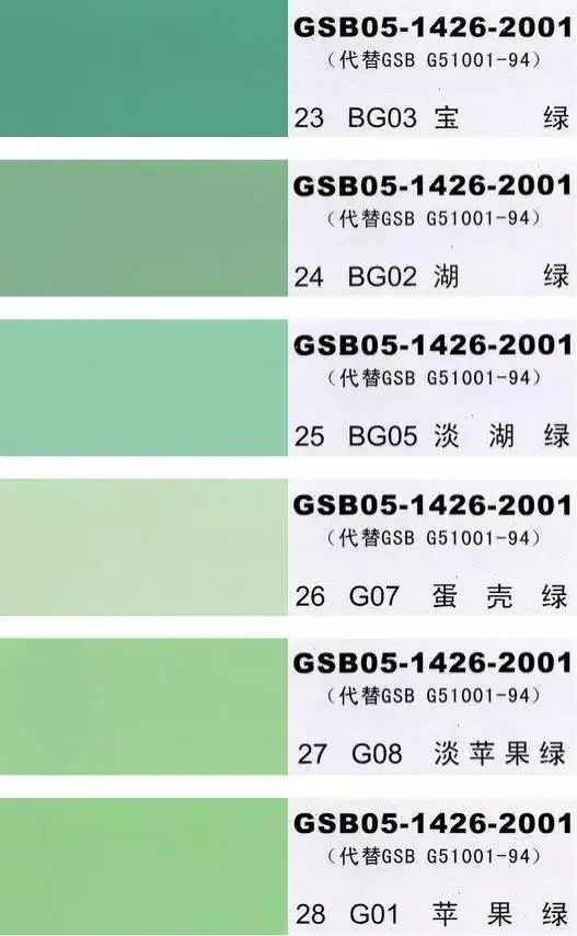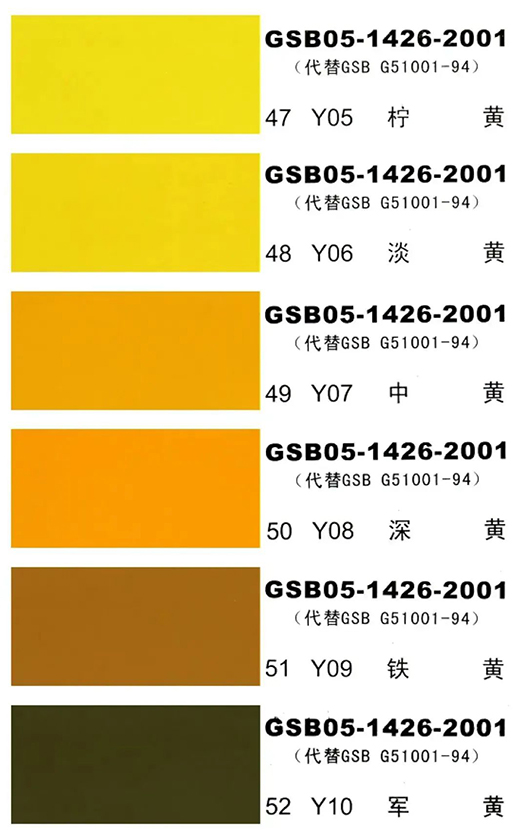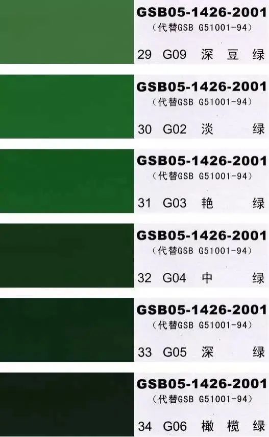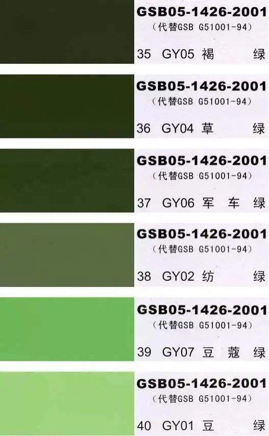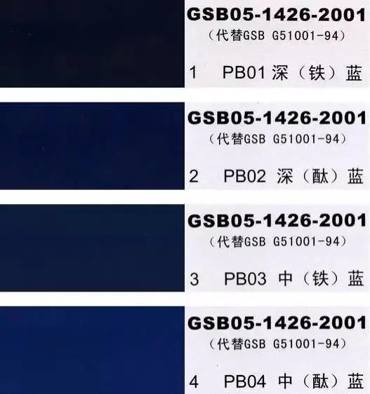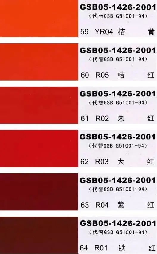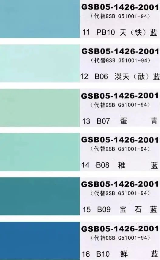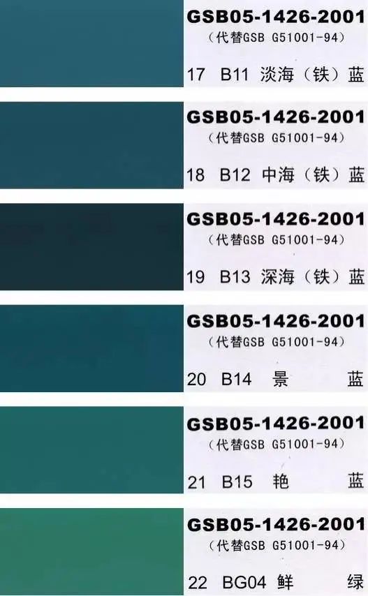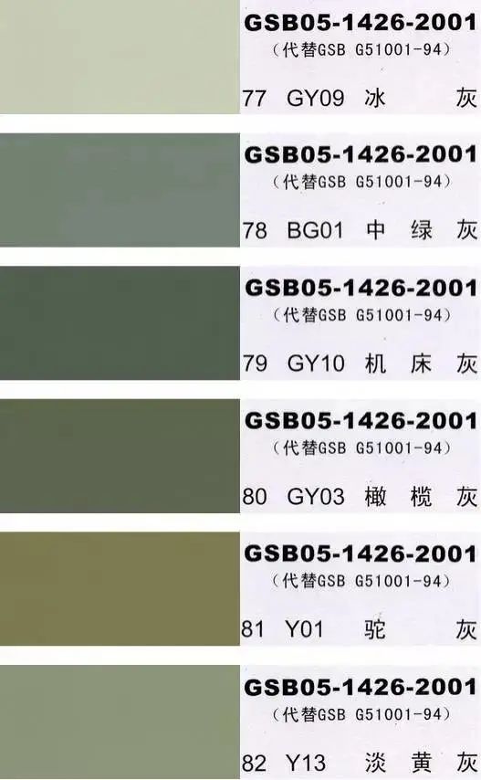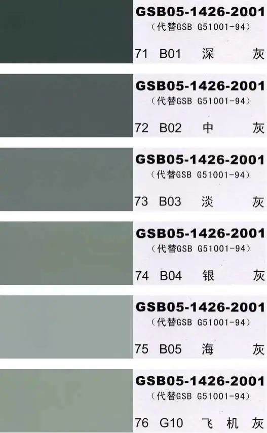 GSB05-1426-2001(代替GSB G51001-94)是全国涂料和颜料标准化委员会根据国家标准GB3181制作的实物标准色卡,在涂料、油漆、颜料、塑胶、金属涂装,等各行业均被广泛采用。含83种颜色,光面效果。每个颜色都有国家统一标准的编号,经典色号:如PB11孔雀蓝、PB10天(铁)蓝、GY09冰灰、R03大红等等。